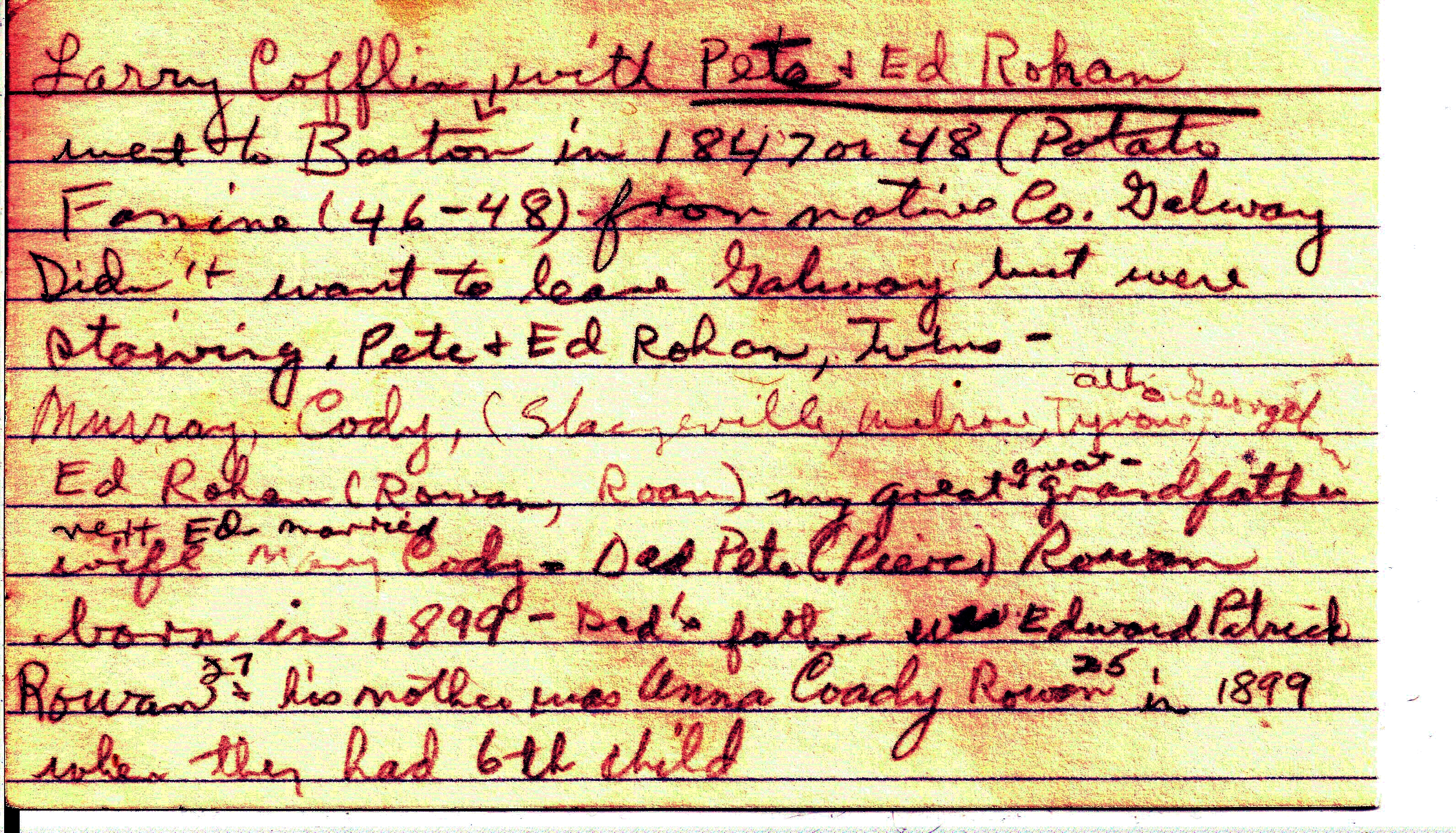 However, it is not surprising that Mary Ann Coughlin remembered the names, “Pete and Ed Rohan.” They belonged to her generation of immigrants’ children. The book describes times she shared with the same-age friend, Rose Anne Roan. She was Patrick’s daughter and had brothers, Peter (1863-1942) and Edward (1868-1928). There was also, a set of twin boys, Edward and Lawrence, born to the younger Edward in 1905. These fellows just happen to be brothers of Pierce “Pete” Rowan, whom Joanne O’Connor identifies as her father.