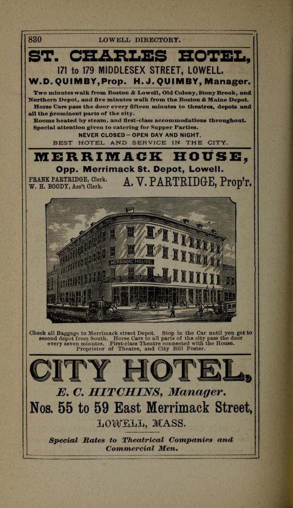 Lowell’s St. Charles Hotel, with the “best service in the city,” was young Phil Fitzpatrick’s first employer. Here he learned of a world beyond Lowell’s textile mills. [8]
